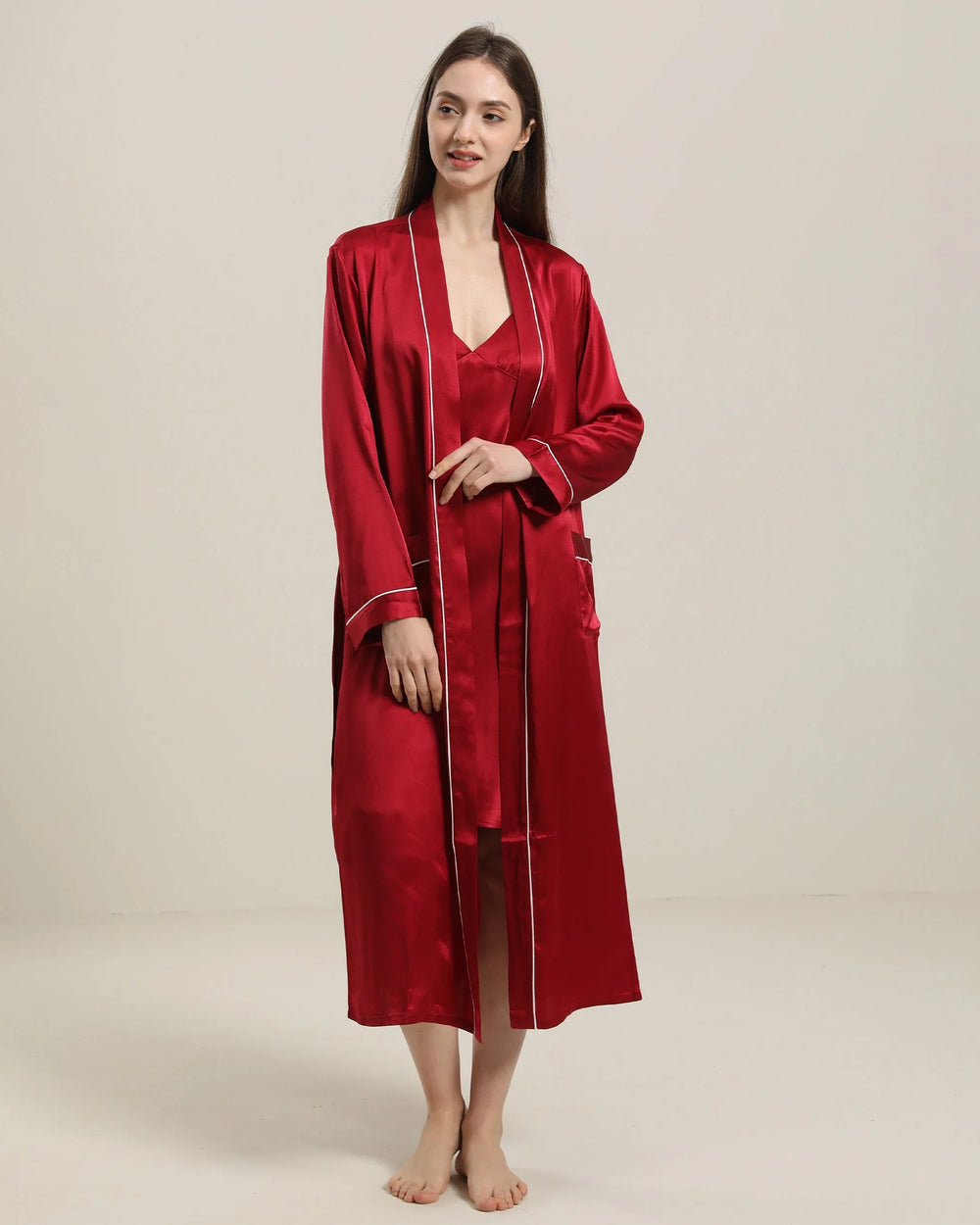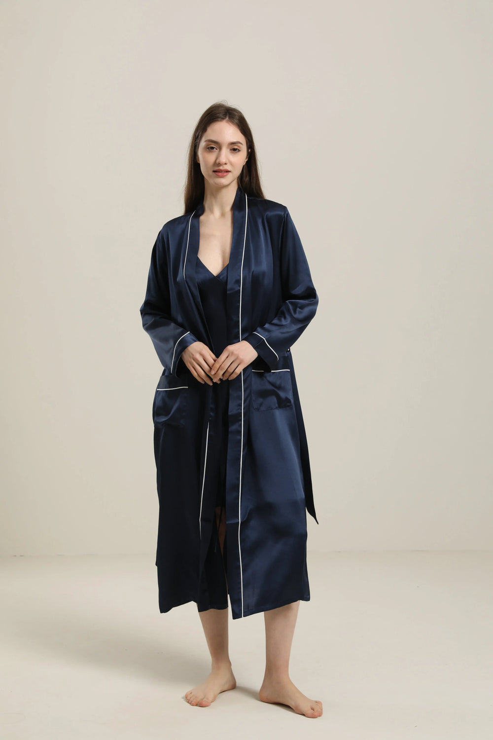 Beautifully finished, pleasantly heavy silk robe, gentle baby or sky blue edged in white piping. Luxuriously long enough in length and in sleeve. Expensive but not really, for the quality delivered. Nicely packaged in a refined box. I will purchase again when the time come.