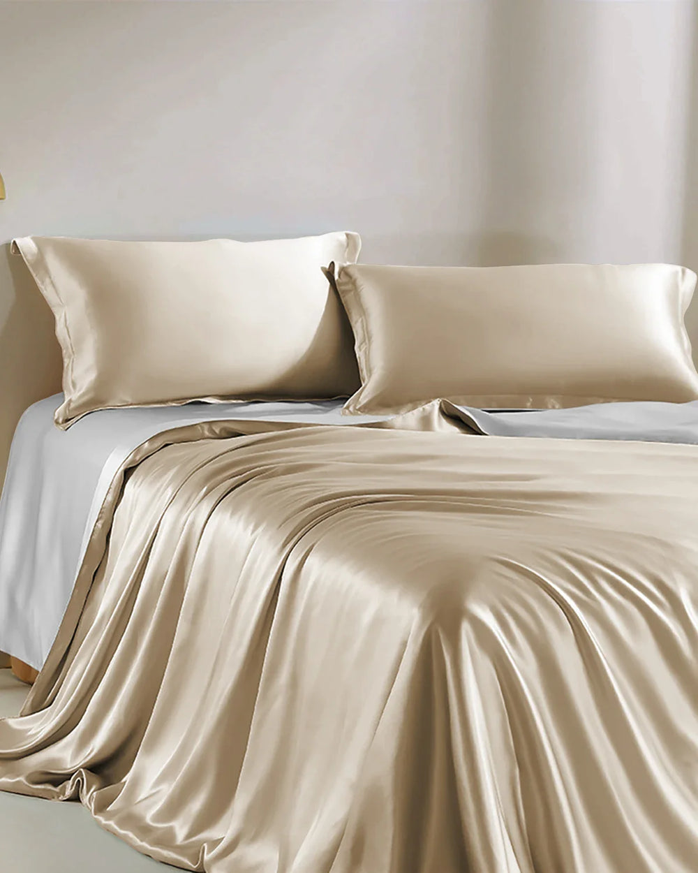 この贅沢な4点セットは、フラットシーツタイプまたはフィットシーツタイプの2つの選択肢があり、どちらもシルバーグレーのシーツとシャンパン色の枕カバーが付いています。シャンパン色とシルバーグレーのリバーシブル掛け布団カバーで、2つのエレガントなカラーを気分に合わせてお楽しみいただけます。