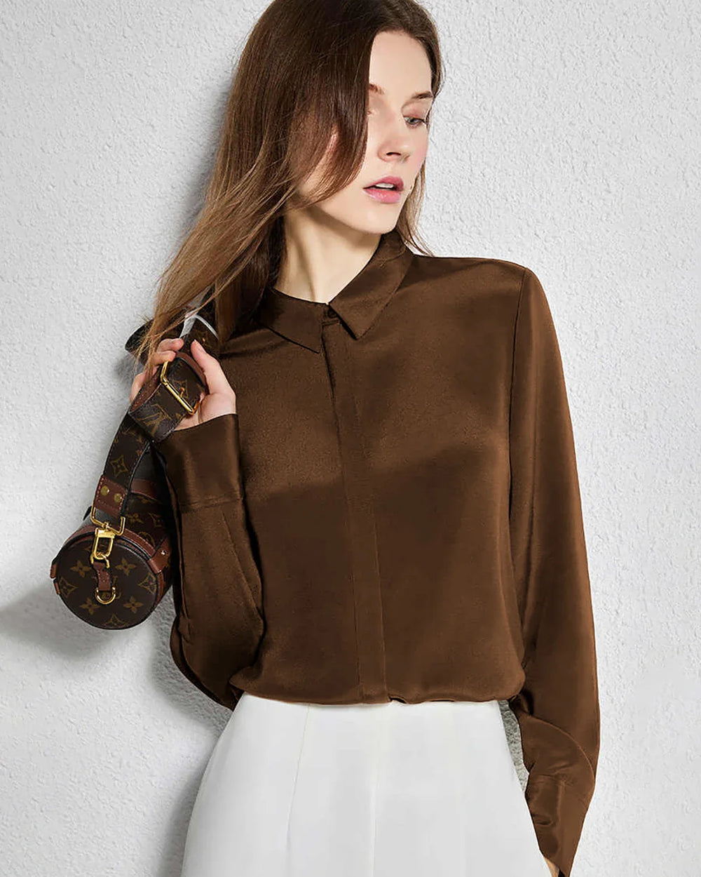 隠しボタン仕様の長袖シルクシャツで、洗練されたエレガントな印象をワードローブにプラス。高品質なシルクを使用し、滑らかな質感と控えめな光沢が上品さを醸し出します。オフィスや夜のイベントに最適で、テーラードパンツやスカートと合わせやすい万能アイテムです。