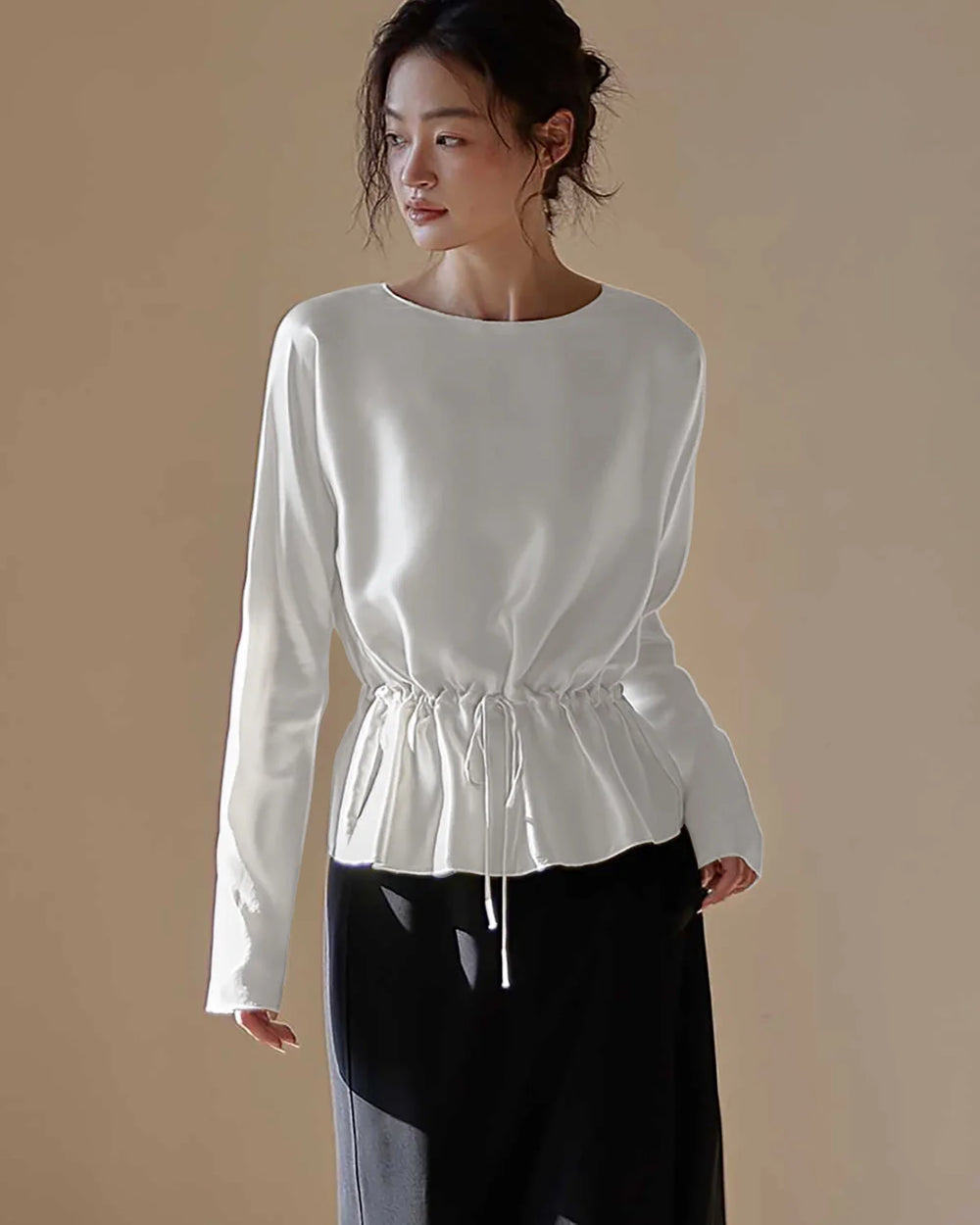贅沢なシルク素材で仕立てられた長袖ブラウスは、ドローストリングウエストデザインを採用しており、フィット感を調整して美しいシルエットを実現できます。滑らかで光沢のある質感とタイムレスなエレガンスが、カジュアルからフォーマルまで幅広いシーンに最適です。スカートやテーラードパンツと合わせてシックなスタイルをお楽しみください。
