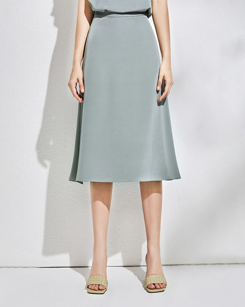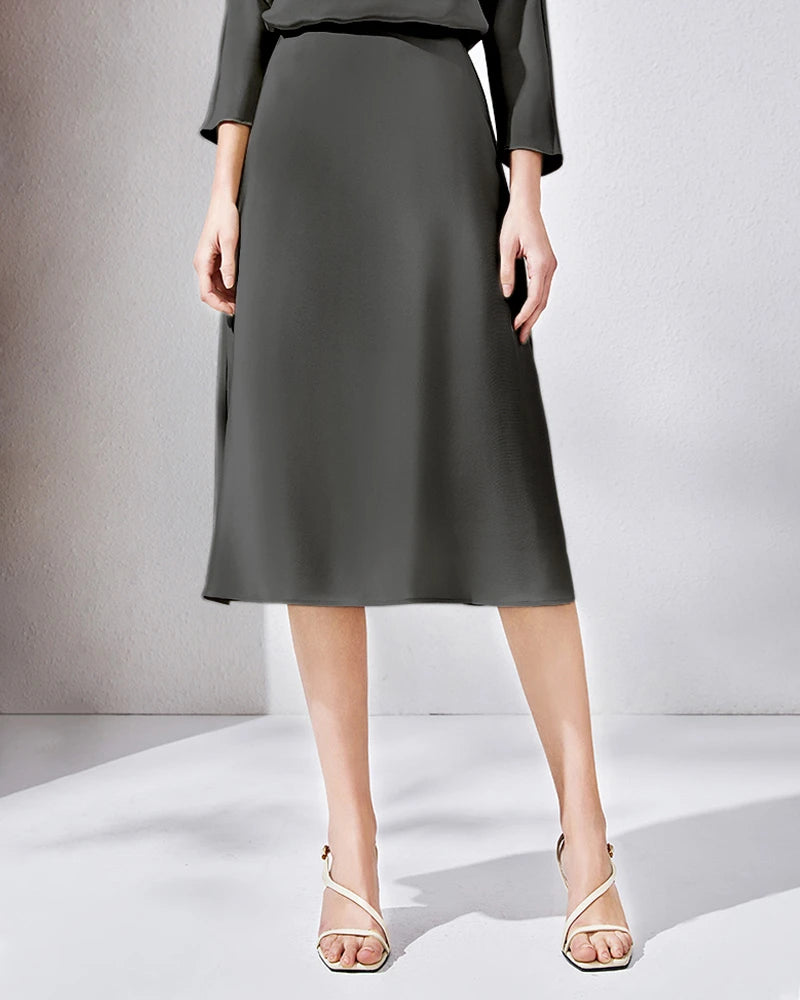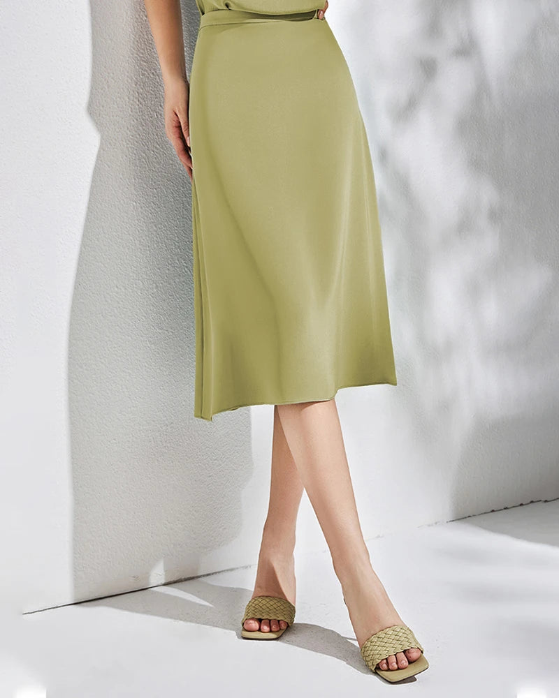 滑らかな仕上がりで、日常のミディスカートから特別な日のグリーンサテンコーデまで、女性にとって必須のシルクスカートです。