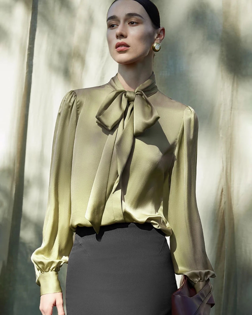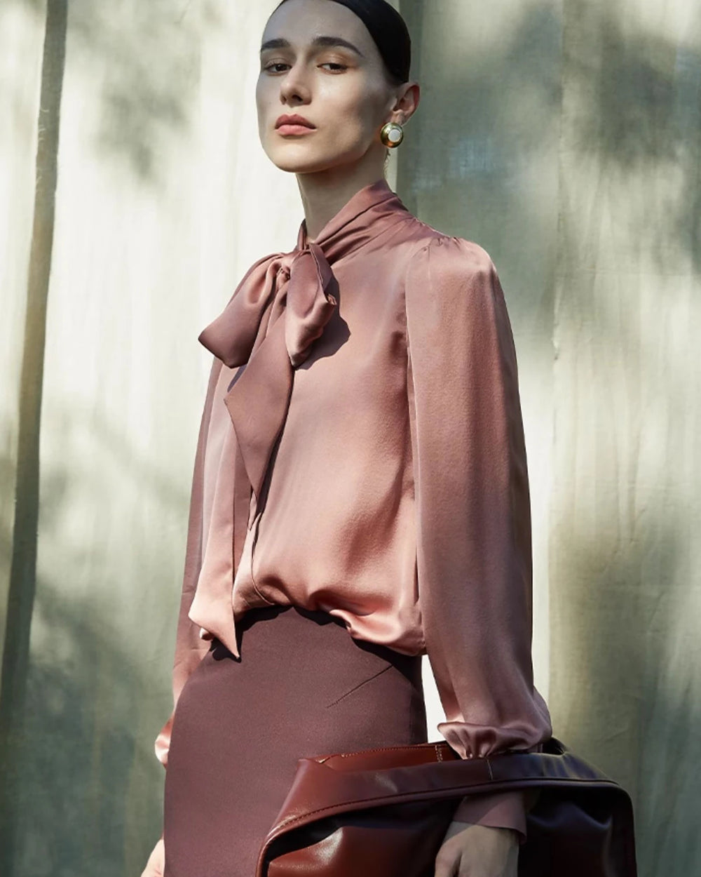 洗練されたタイネックのディテールは多様な着こなしを可能にし、きちんと感を出すならボウタイブラウスとして、または緩く結んでリラックスしたシックな雰囲気を演出できます。