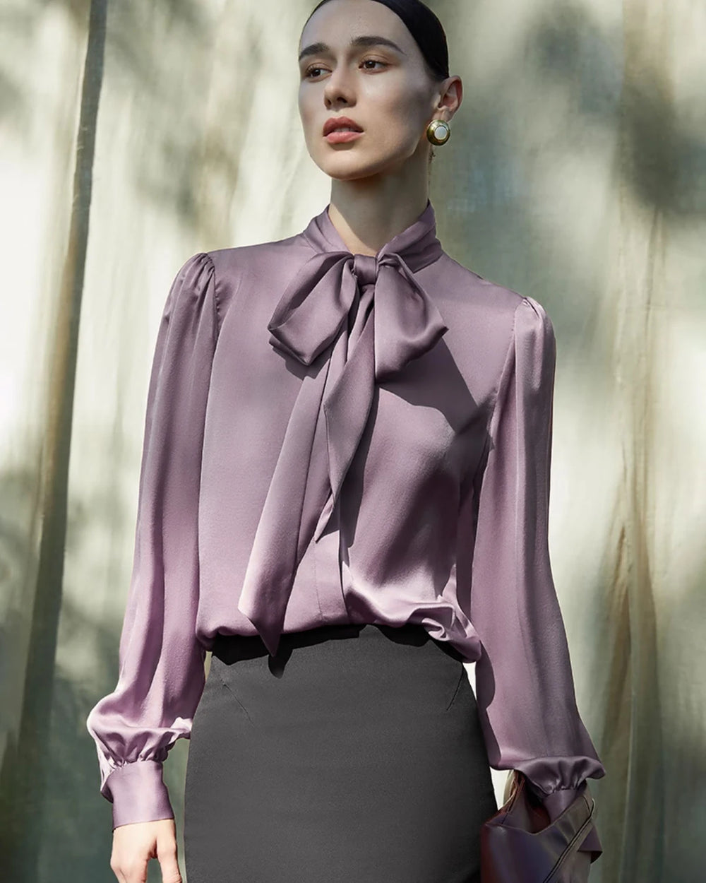 このタイフロントシルクブラウスは、エレガントなボウタイネックライン、長袖、そして流れるようなシルエットが特徴です。