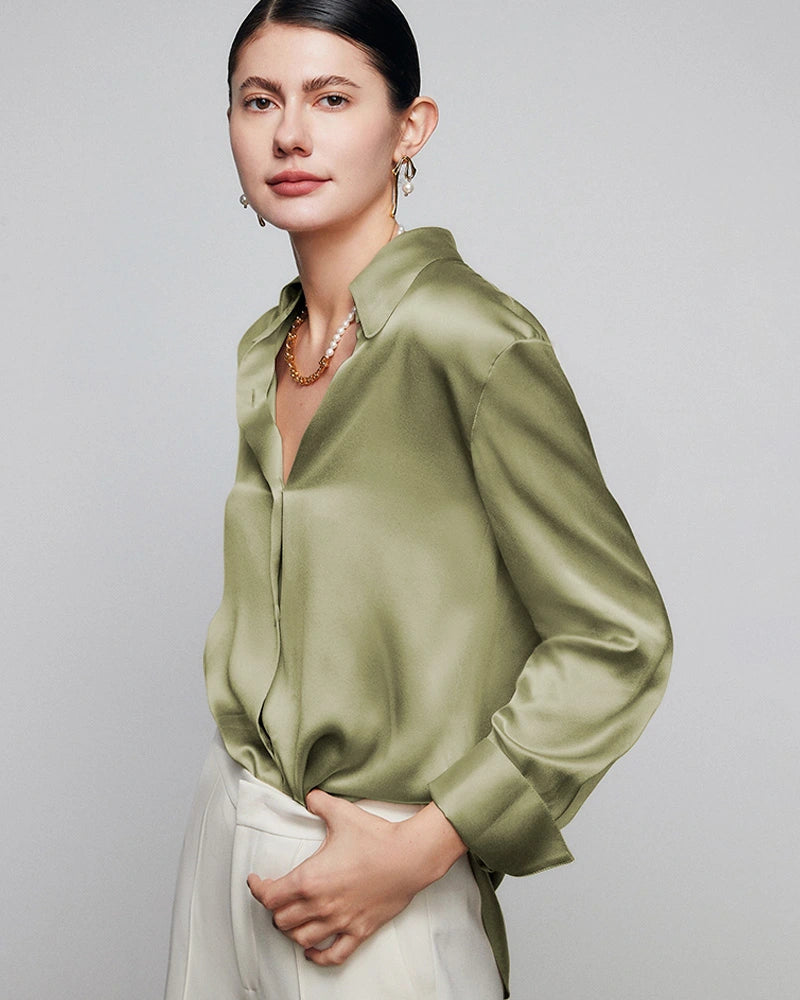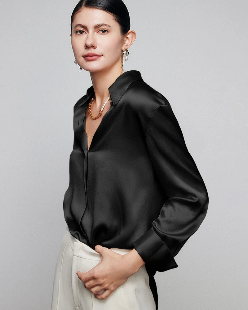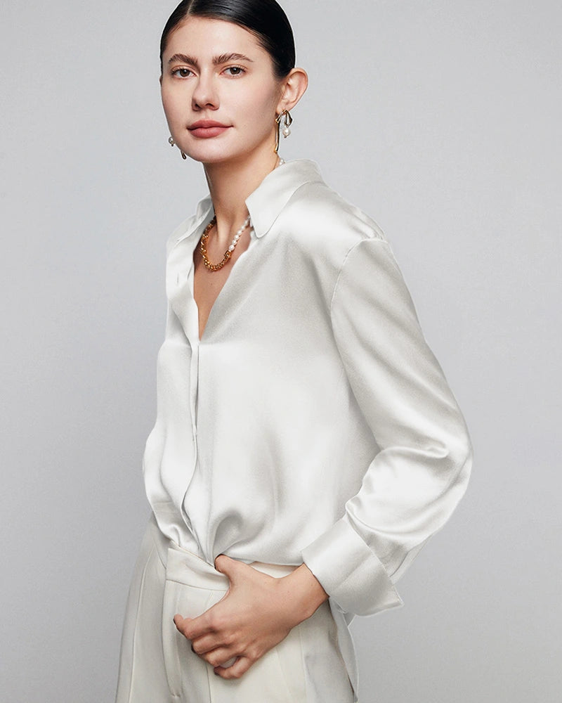 通気性が高く、低刺激で、天然の温度調節機能を持つこの長袖シルクシャツは、一日中快適でエレガントな着心地を提供します。オフィス用のシルクブラウスとしても、フォーマルなトップスとしても最適です。ホワイトは清潔感のある印象を、ブラックなどのダークカラーはシックな魅力を演出します。プラスサイズも展開しており、すべての女性に30匁シルクの贅沢な着心地をお届けします。