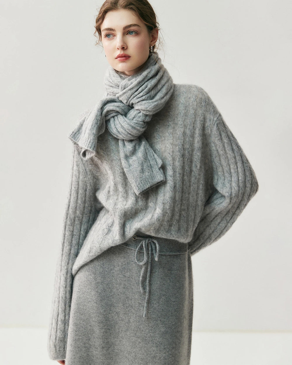 クラシックなケーブル編み模様で仕立てられたこの多用途なショールは、上品なドレープとタイムレスなシルエットが特徴です。レディース用のカシミヤラップスカーフやショールとして、またはメンズ用のカシミヤマフラーとしても活躍し、さりげない質感が日常使いにもフォーマルな装いにもスタイリッシュさを添えます。