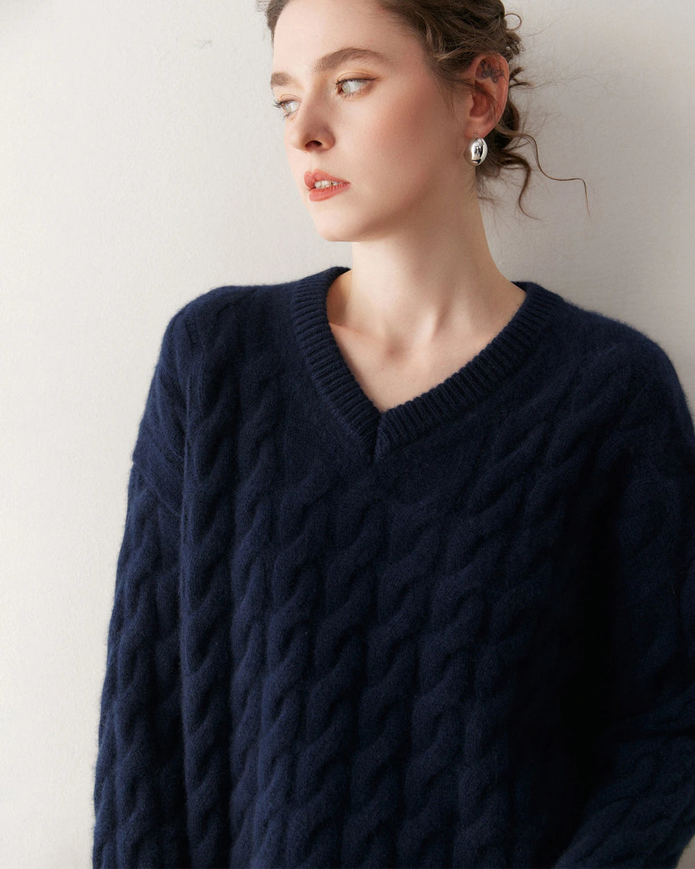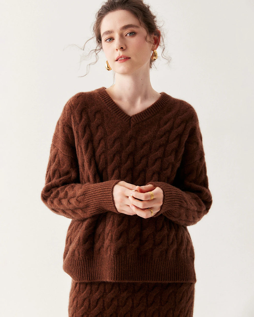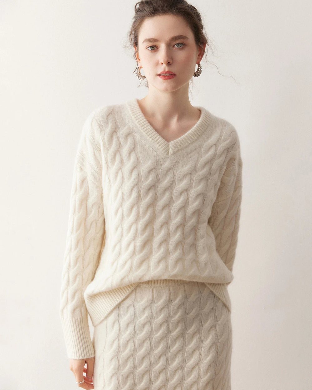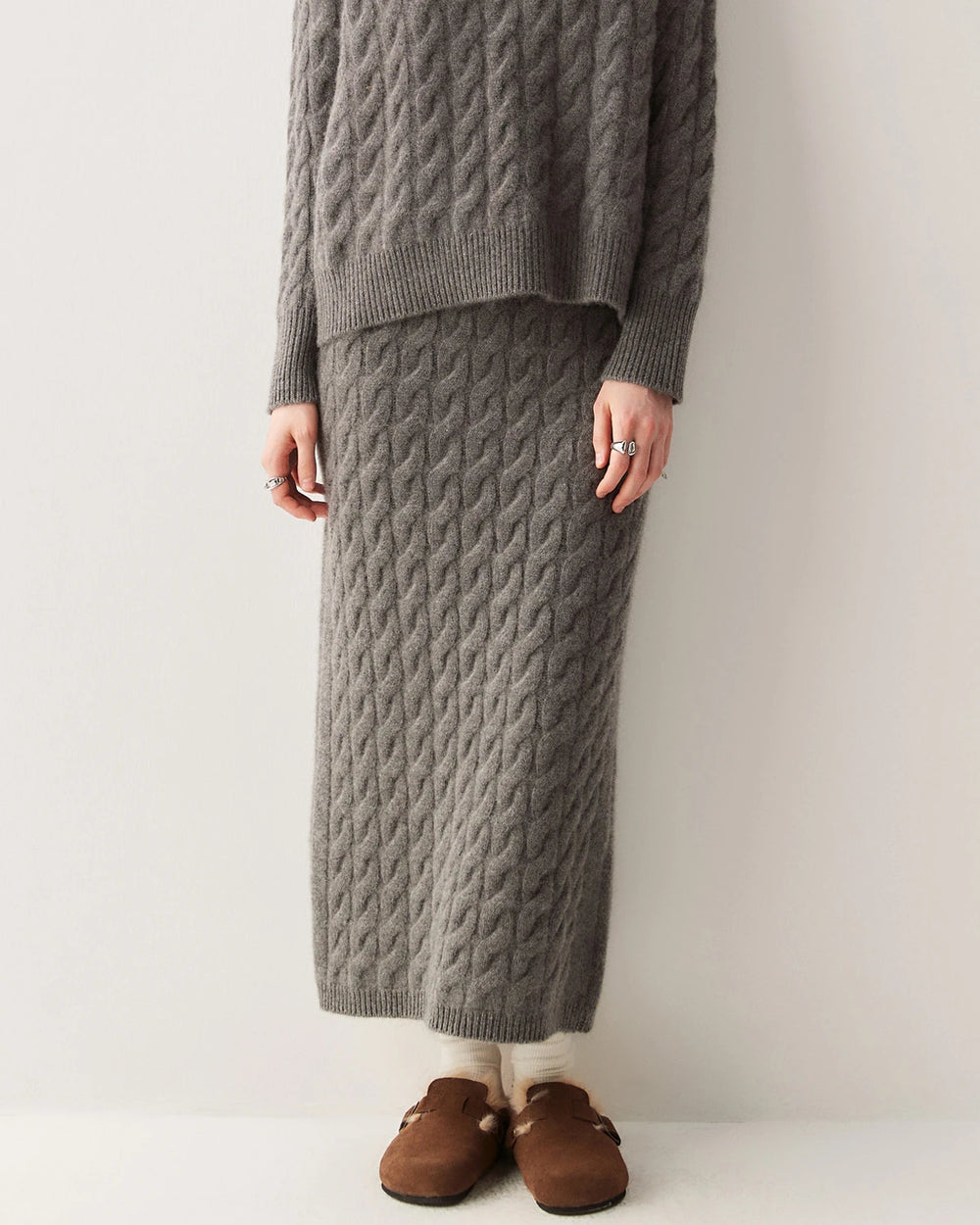 このセットには、リラックスフィットのVネックケーブル編みカシミヤプルオーバーと、ストレートラインのロングカシミヤスカートが含まれます。セーターはドロップショルダーでゆったりとした着心地を実現し、マキシスカートは縦のラインを強調してシルエットを美しく見せます。セットアップとしても単品としても、どちらも控えめなエレガンスを演出します。