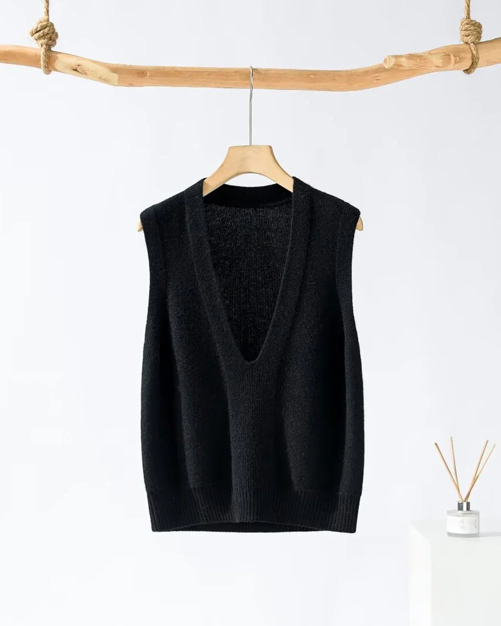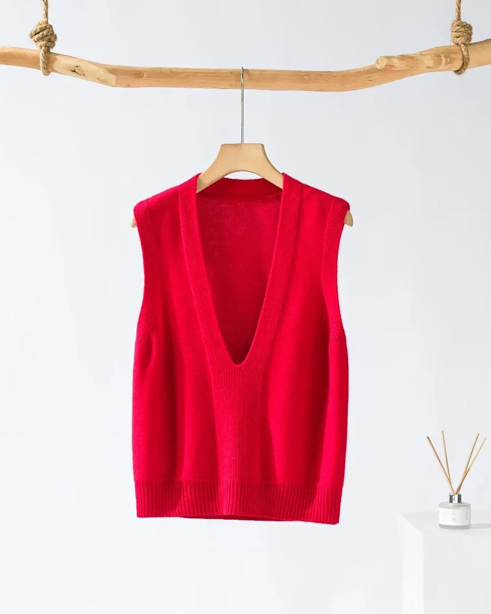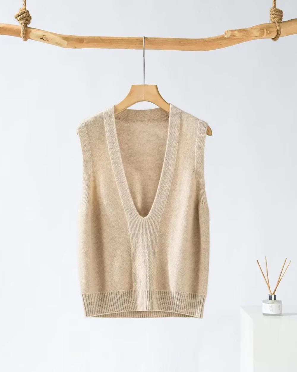 I absolutely love this cashmere vest! The fabric feels so soft against my skin, and the deep V neck is such a stylish touch. Perfect for layering with a blouse underneath.