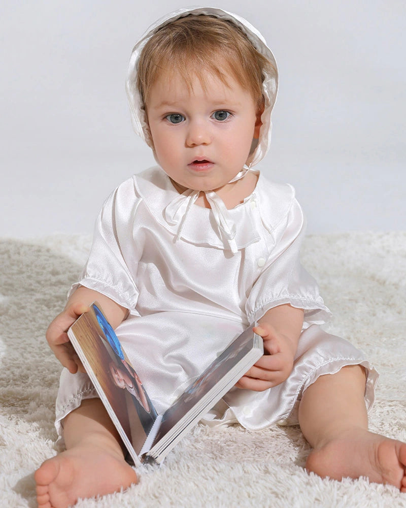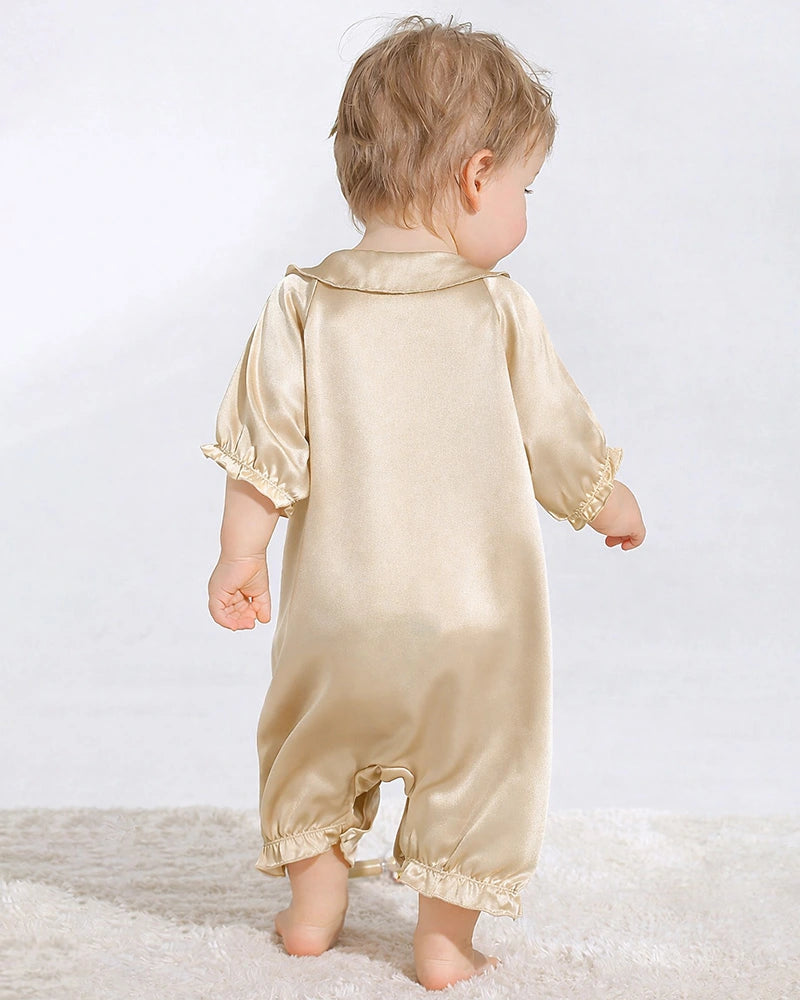 洗練されたカラー展開でご用意したドールカラー&パフスリーブのベビー用シルクロンパースは、ラグジュアリーさと実用性を兼ね備えた一着です。上質な素材と美しいデザインで、赤ちゃんのワードローブをワンランク上へ。
