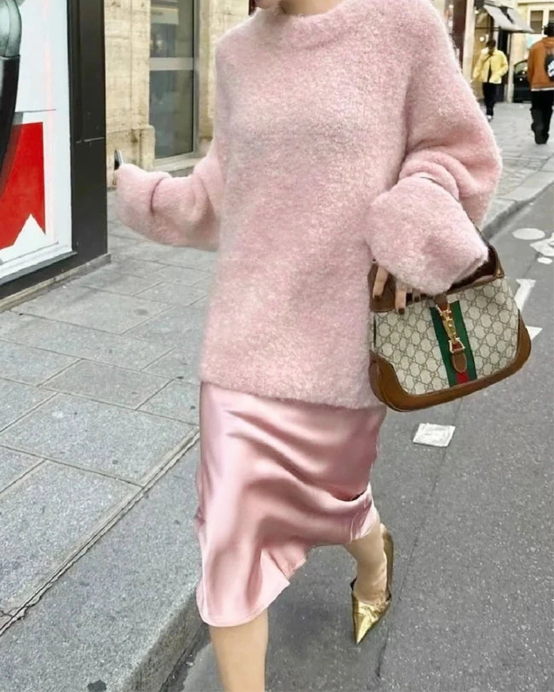 秋冬の定番コーディネートのひとつです。同系色でまとめると全体が引き締まり、異なる素材を組み合わせると奥行きとコントラストが生まれ、簡単ながらエレガントなスタイルに。フィット感のある素材はお腹周りが気になる方には最適でない場合もありますが、オーバーサイズのセーターを取り入れると自然にカバーしつつ、リラックス感のある上品な雰囲気をプラスできます。