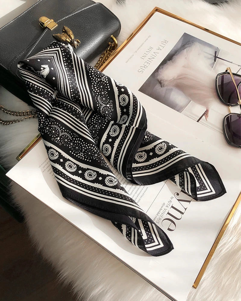 この正方形のシルクスカーフは、ペイズリー柄、馬のモチーフ、ベルト風のディテールを組み合わせた印象的な白黒プリントを特徴としています。デザインは乗馬のエレガンスとタイムレスなペイズリースタイルを融合。汎用性のあるサイズで、レディースヘッドスカーフ、シルクヘッドラップ、または洗練されたシルクショールとしてスタイリングできます。