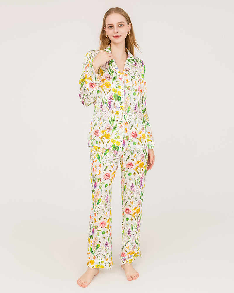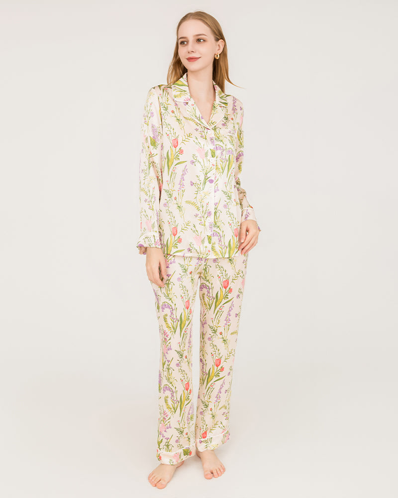 These pajamas have a gorgeous floral design with a cool silk material for summer. They're comfortable and fit pretty true to size. I love them!