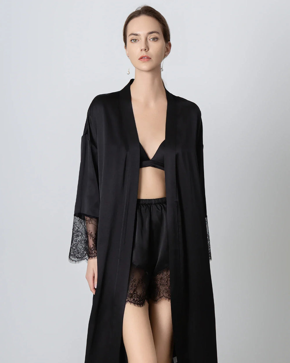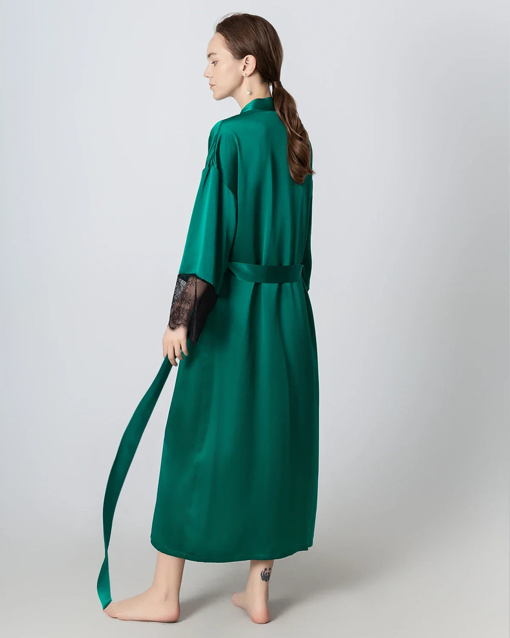 This silk robe is a dream come true! The full-length design is so elegant, and the lace trim adds a touch of luxury. It feels incredibly soft against the skin.