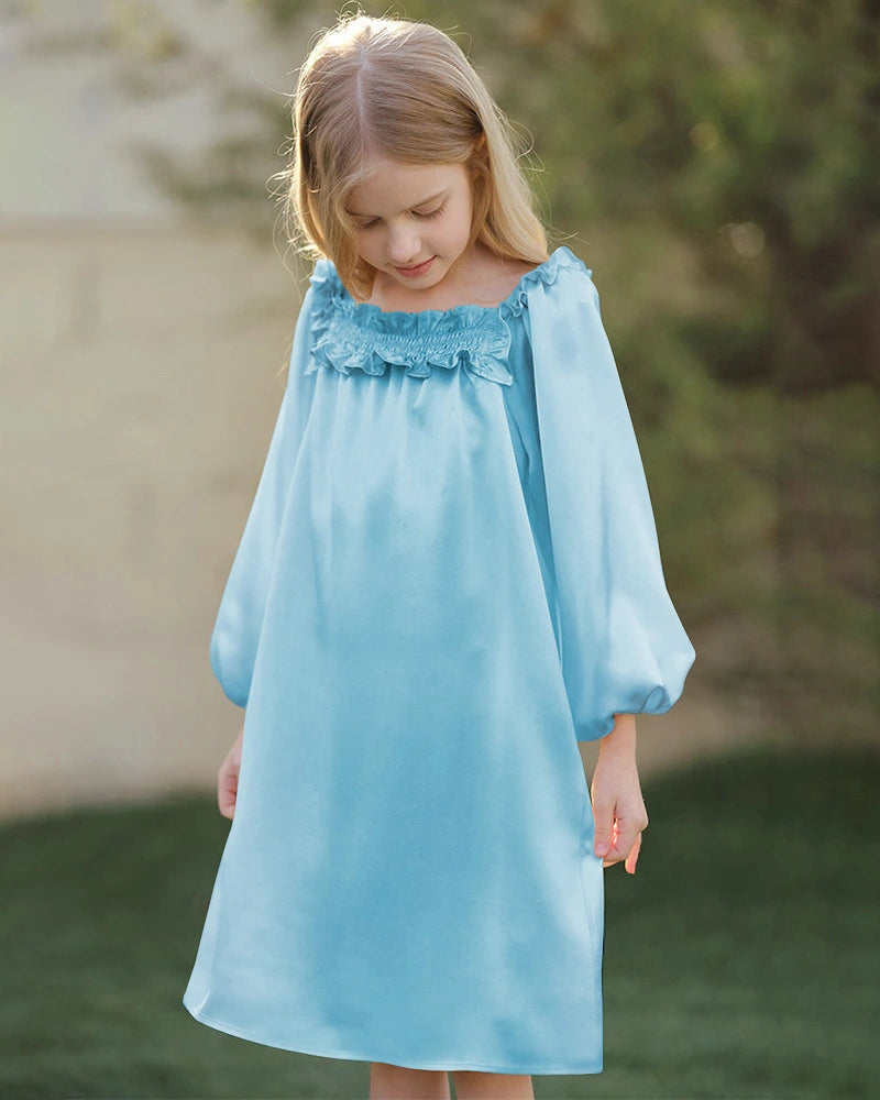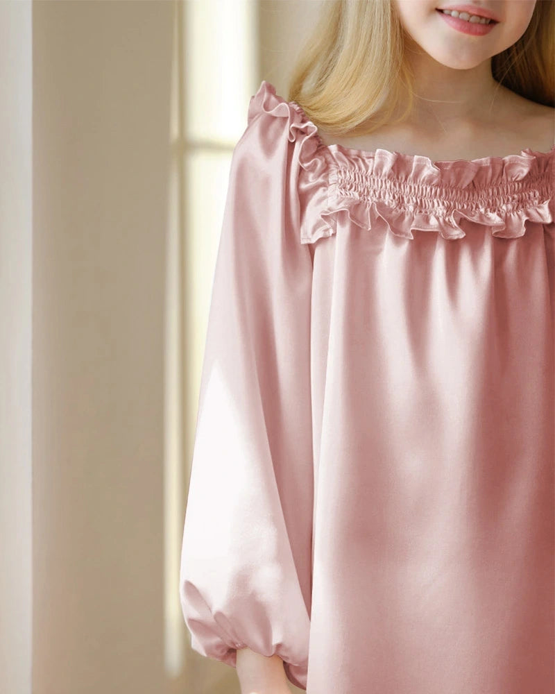 長袖のシルエットが程よいカバー力を与えつつ、リラックス感のある着心地を実現。やさしくギャザーを寄せたフリルネックが、クラシックで上品な印象を添え、一般的なパジャマを超えたデザインに仕上がっています。シルクのナイトドレスとしてはもちろん、カジュアルなキッズ用シルクワンピースとしても着用できます。