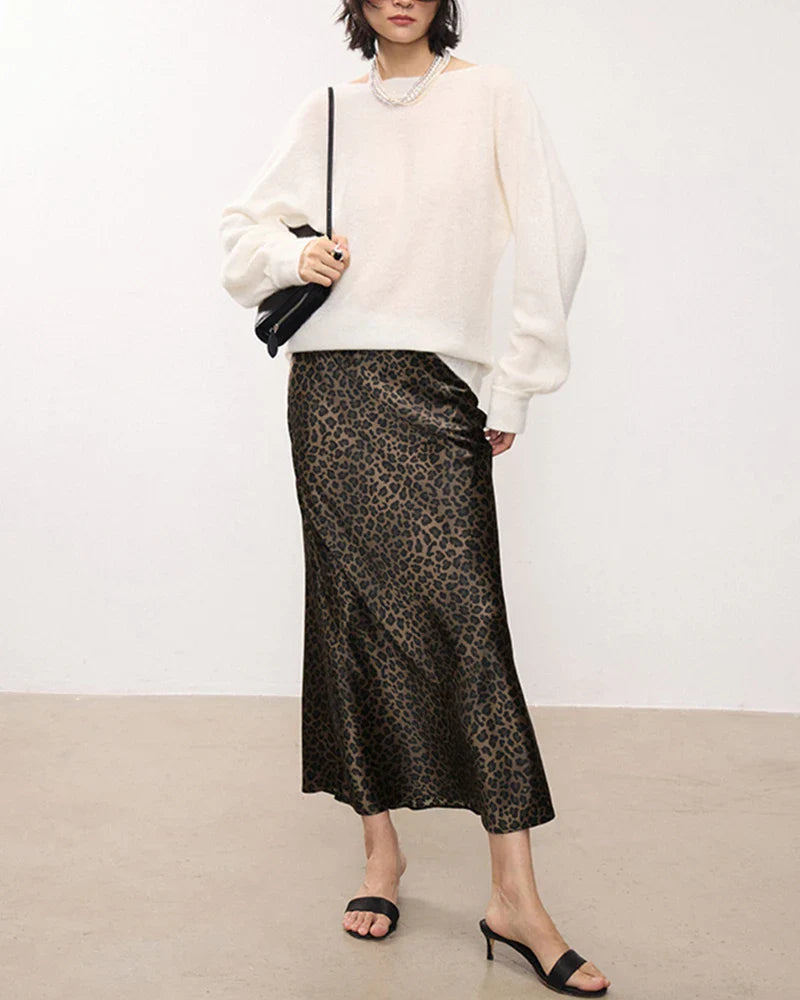 大胆なレオパード柄が特徴のこのハイウエストシルクミディスカートは、ワイルドな洗練さと時代を超えた魅力を兼ね備えています。バイアスカットのデザインは優雅で体型を美しく見せるシルエットを作り、歩くたびに美しく揺れます。