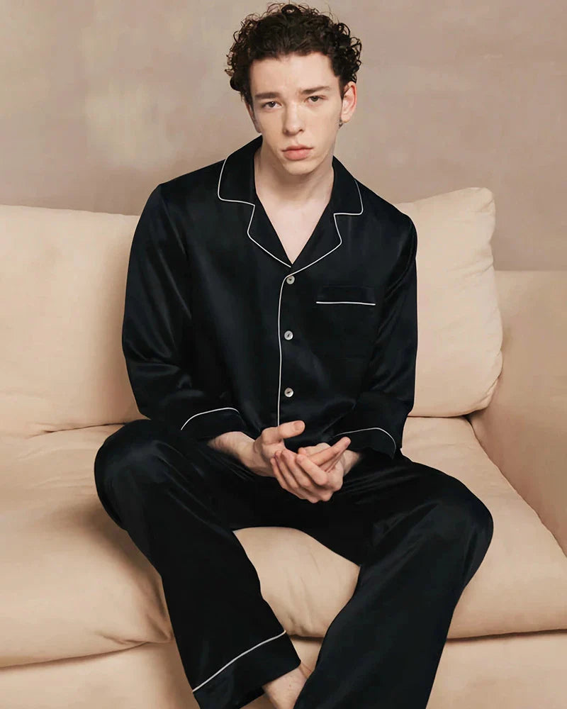 100%洗える22モミシルクシャルムーズを使用したメンズシルクパジャマセットは、比類のない柔らかさ、通気性、そして上品さを提供します。100%シルクのメンズパジャマやプレミアムな洗えるメンズシルクパジャマをお探しの方に最適な、快適さと耐久性を兼ね備えた高級素材です。