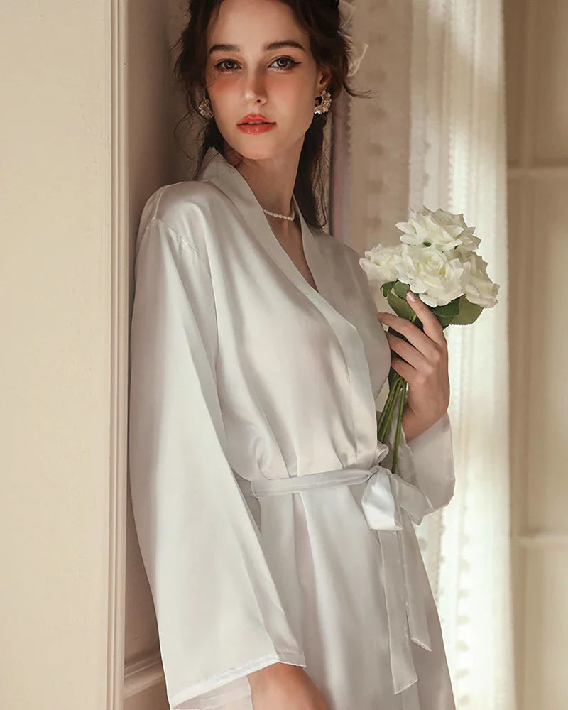 モーニングローブ、ブライダルローブ、またはロング丈の花嫁用ローブとしても活躍する多機能ローブ。日常使いから結婚式の準備シーンまで幅広く使えます。ブラッシュ、アイボリー、ブラックなどの色展開があり、ブライズメイド用ガウンやミディ丈シルクローブ、ゆったりサイズのシルクローブをお探しの方にもおすすめです。