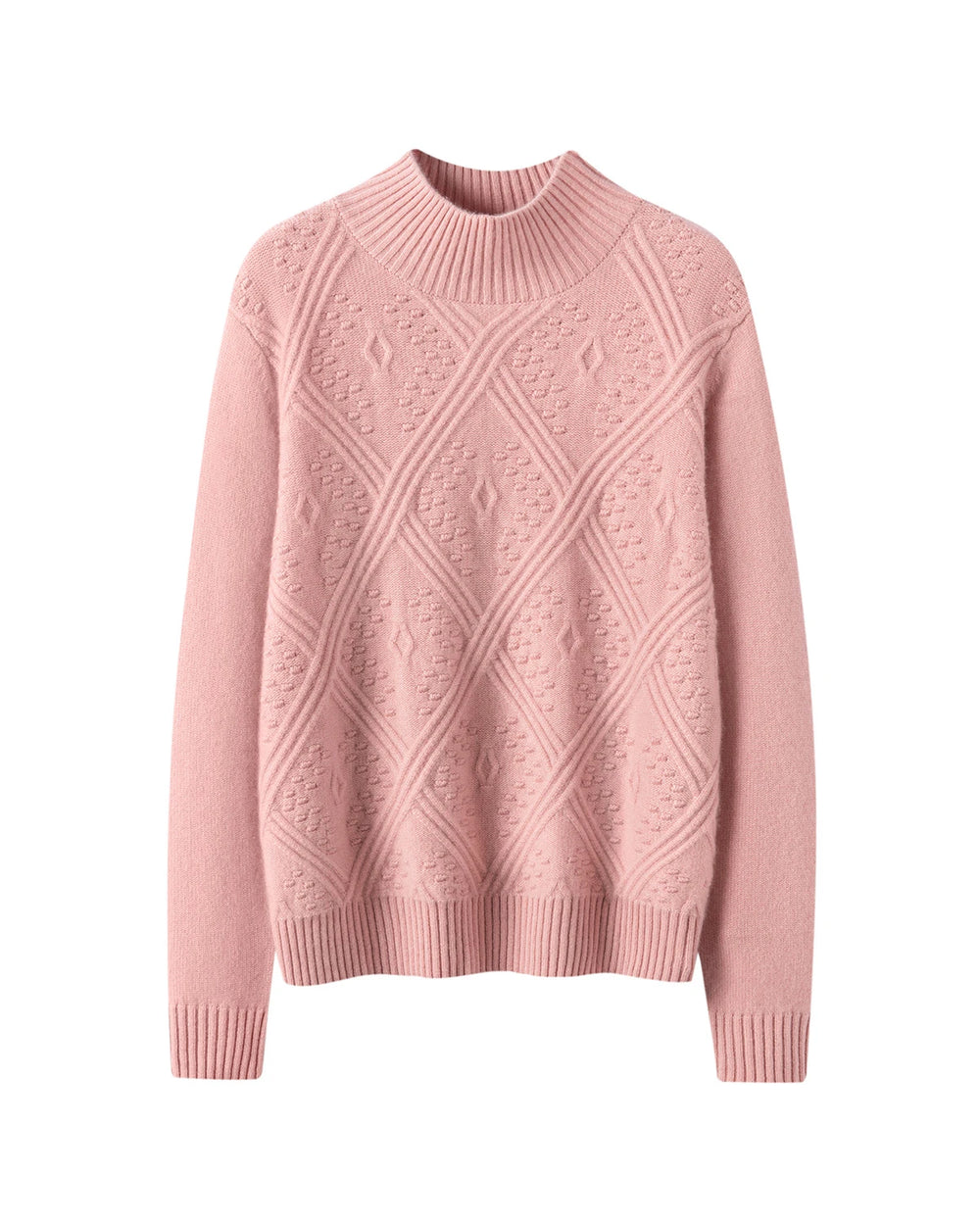 洗練されたダイヤモンド編みのパターンが、このカシミヤプルオーバーにテクスチャーと奥行きを加えます。柔らかいモックネックとすっきりとしたシルエットで、あらゆる体型を美しく見せつつ、暖かさを提供します。時代を超えたこのレディースカシミヤセーターは、クラシックな魅力と洗練された現代的な感覚を兼ね備えています。