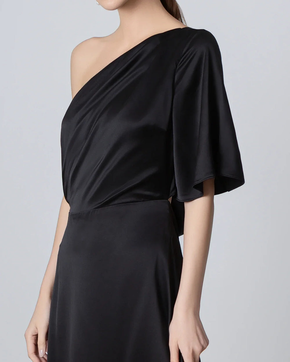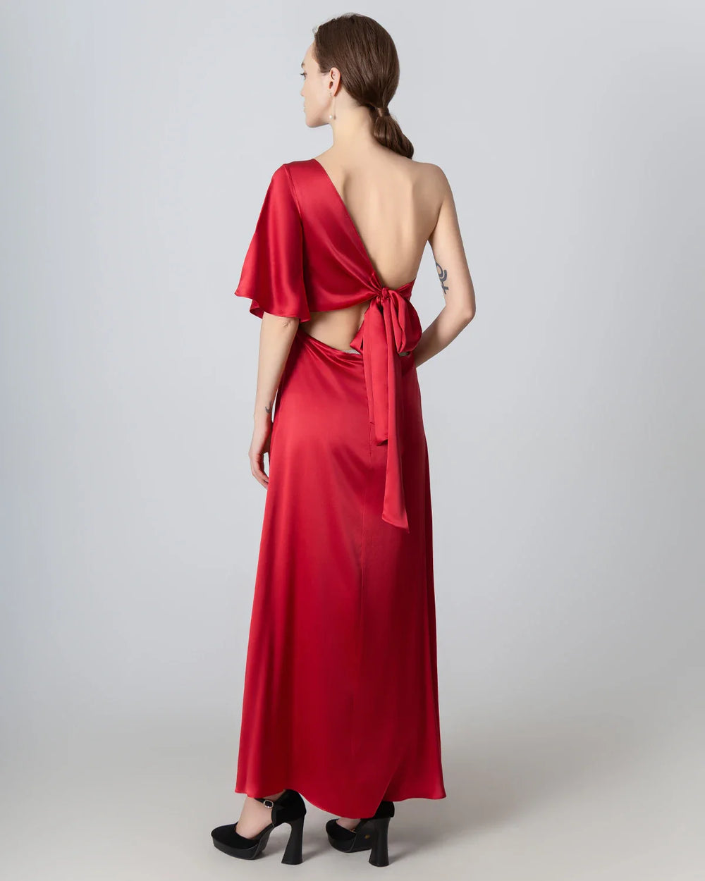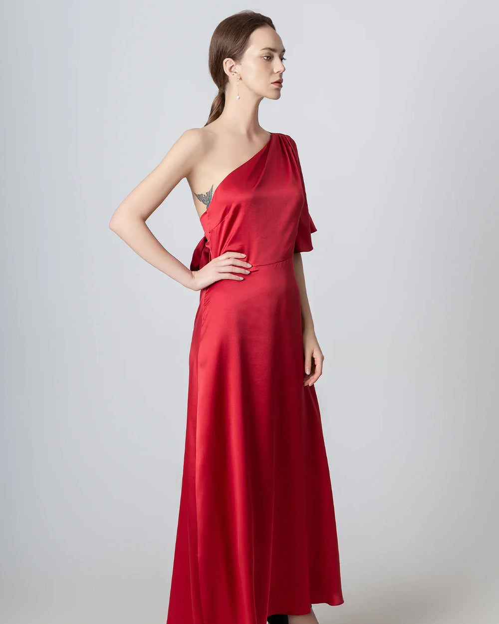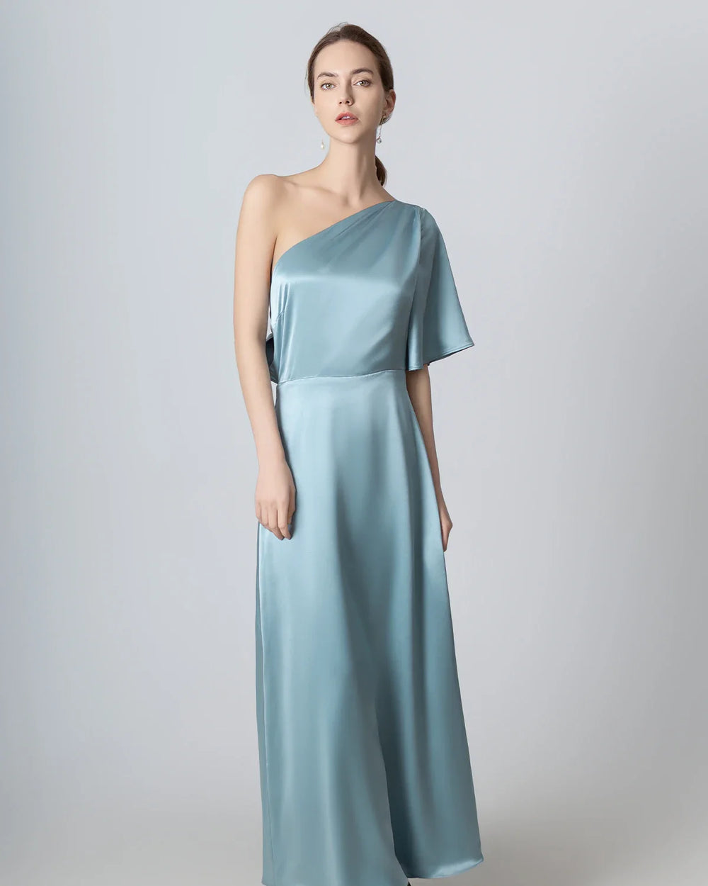 ワンショルダーデザインがエレガンスを醸し出し、繊細なタイバックがロマンチックな魅力を添え、見る者の視線を惹きつけるシルエットを作り出します。流れるようなマキシ丈は動きと優雅さを引き立て、特別な場面に最適です。