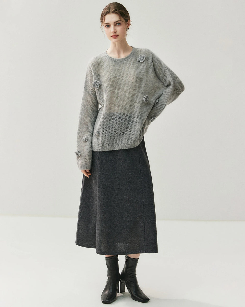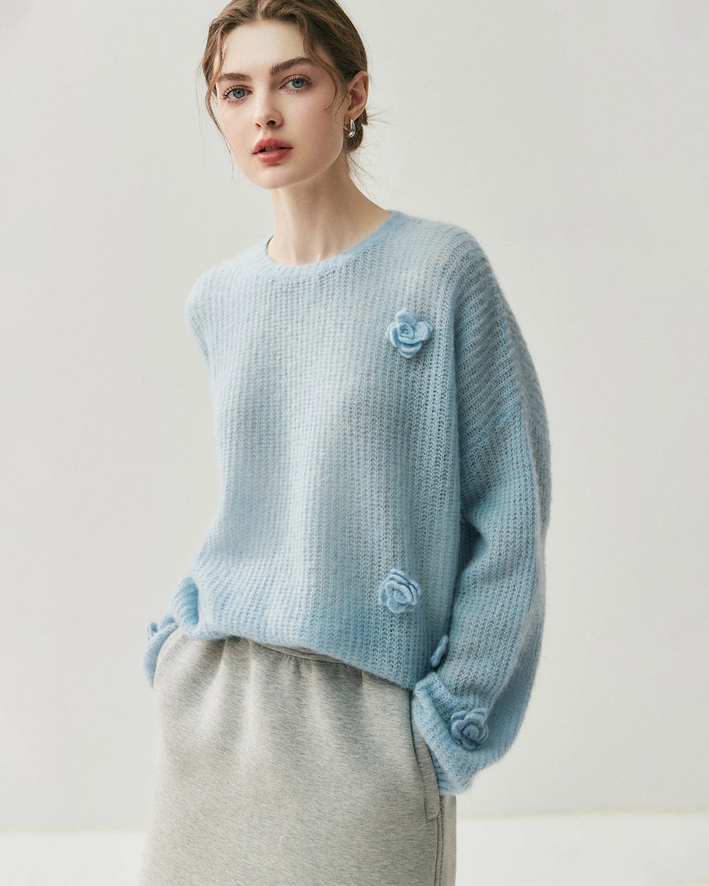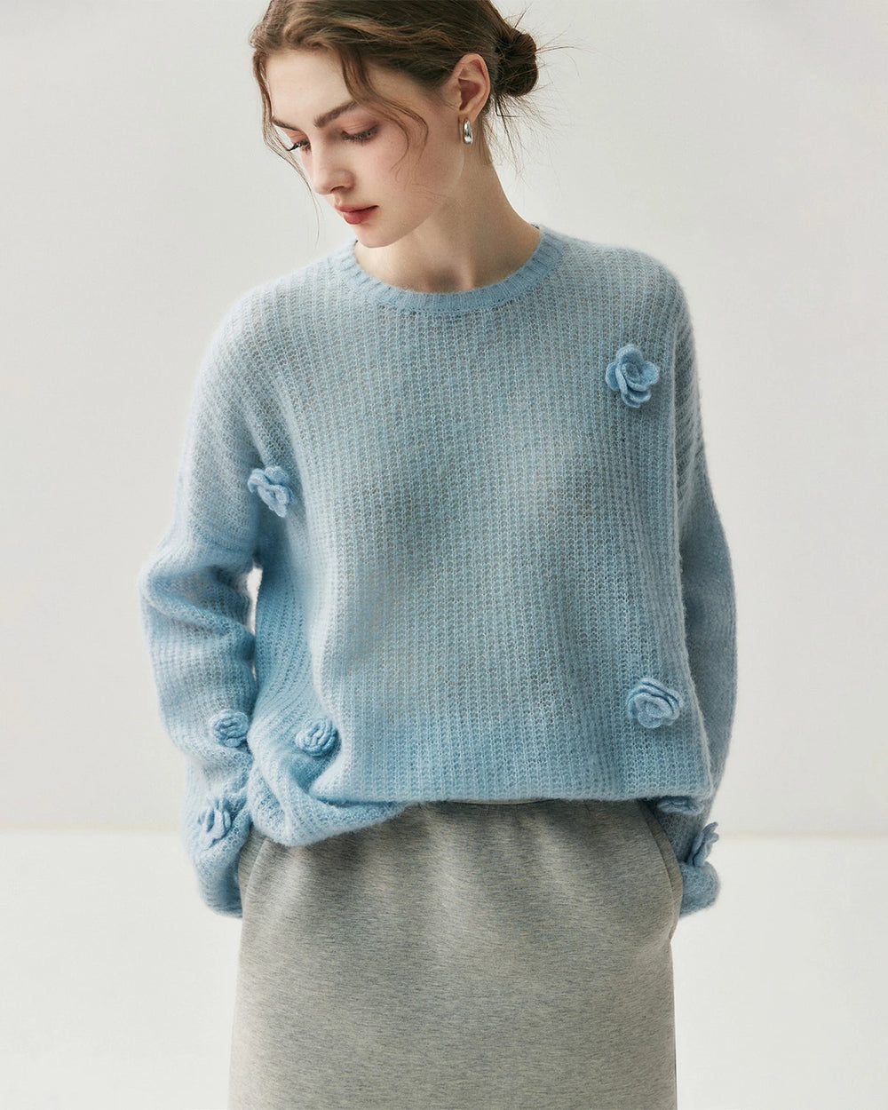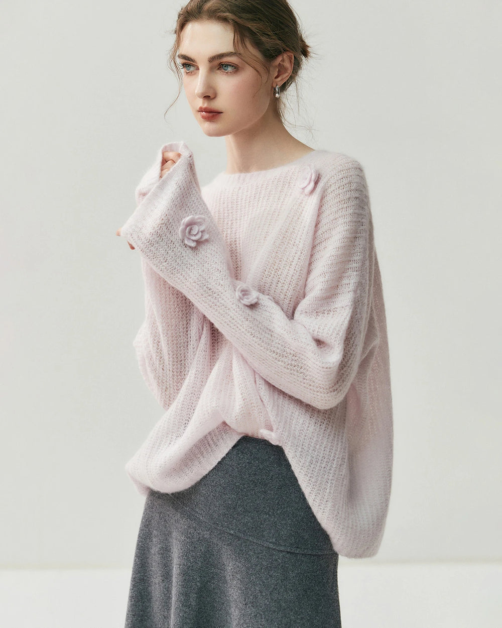 このクルーネックのオーバーサイズプルオーバーは、同じカシミヤ糸で編まれた立体的なフラワーニットディテールが特徴です。繊細な装飾がクラシックなシルエットに女性らしさを添え、モダンなワードローブに欠かせない万能アイテムとなります。
