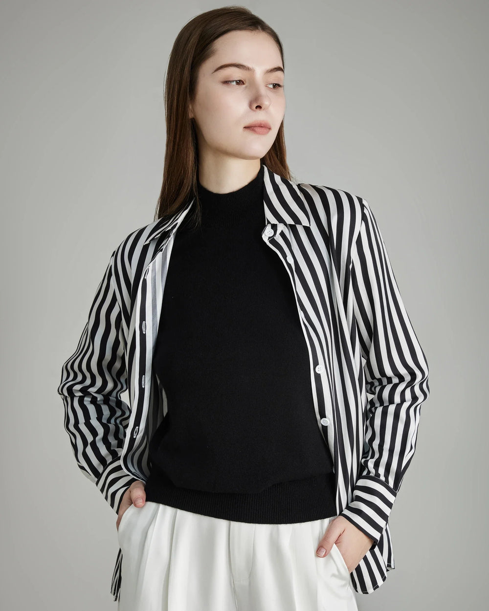 This oversized silk shirt is my new go-to! The fabric is luxurious, and the vertical stripes make it perfect for both casual and office wear.