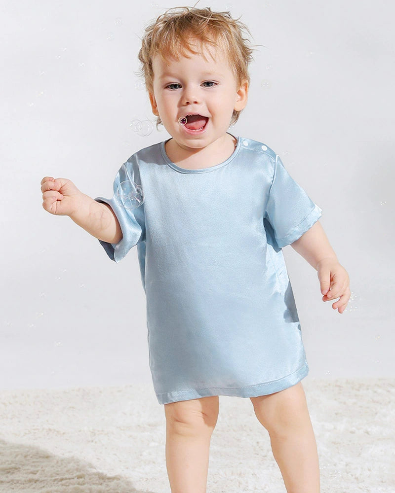 毎日の装いをワンランク上へ導く、半袖ベビーシルクTシャツ。100%ピュアシルクを使用し、赤ちゃんのデリケートな肌にもやさしい、なめらかで快適な着心地を実現します。シルク本来の高い通気性により、どんなシーンでも快適さを保ちます。