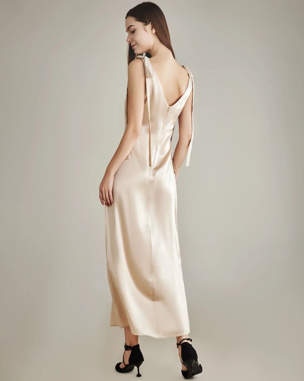 繊細な肩リボン付きで調節可能なフィット感を実現した、タイムレスなエレガンスを纏う女性用シルクスリップドレスです。高品質なシルク素材を使用し、肌に柔らかく贅沢な感触をもたらします。特別な場面や上品なリラックスタイムにぴったりで、ミニマルなシルエットと光沢のある美しい質感が優雅でフェミニンな印象を演出します。