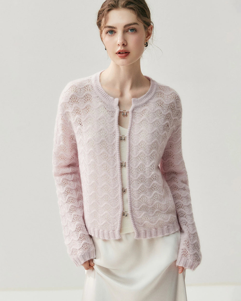このラウンドネックのフロントオープンカーディガンは、繊細な花柄の透かし編みディテールが施され、軽やかでスタイリッシュな印象を与えます。ユニークな涙型のメタルボタンが従来の留め具に代わり、このカシミヤカーディガンをモダンで洗練されたスタイルに引き上げています。