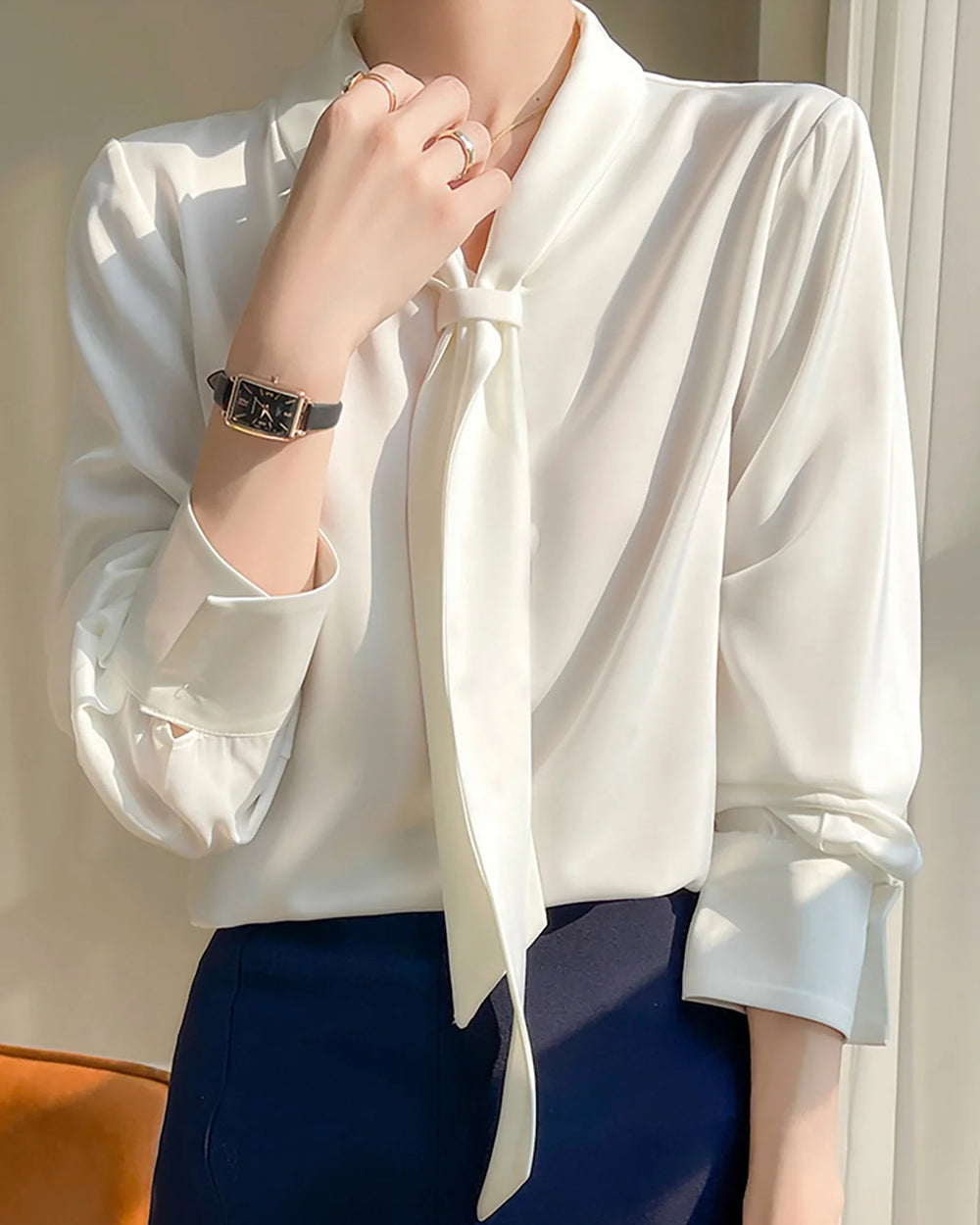 高級100%シルクで仕立てられたこのブラウスは、繊細なタイフロントリボンと洗練された襟付きネックラインが特徴で、日常使いからビジネスシーンまで幅広く活躍します。軽やかな生地は柔らかく流れるようなドレープを作り、一日中快適で上品な着心地を提供します。時代を超えたデザインはスカート、パンツ、ジーンズとも相性が良く、あらゆる場面で活躍する必須アイテムです。シックで機能的なこのブラウスでスタイルを格上げしましょう。