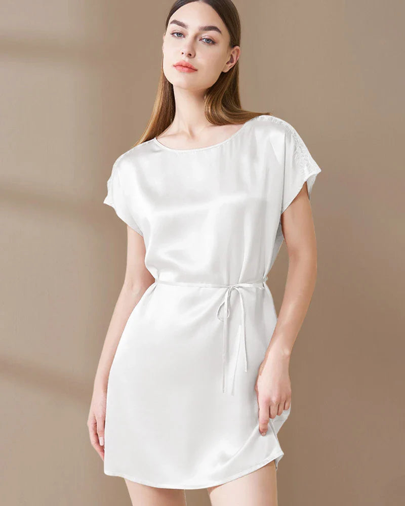このショート丈のシルクナイトガウンは、柔らかなラウンドネック、キャップスリーブ、肩部分の繊細なレース切り替えが特徴です。ウエストは細身のタイベルトでシェイプされ、女性らしいシルエットを演出します。袖付きのシルクナイトガウン、シルクスリープシャツ、またはドレス風のシルクパジャマをお探しの方に、エレガンスと実用性を兼ね備えたデザインです。