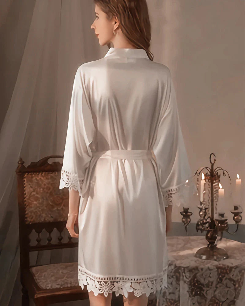 女性用ショートシルクローブは、エレガンスと着心地の良さを追求した仕立てで、ブライダルローブ、ブライズメイドローブ、メイド・オブ・オナー用ローブに理想的です。繊細なレースのブライダルローブディテールが結婚式の朝のローブやブライズメイドの準備用ローブとしての魅力を高め、ショート丈が美しいフィット感と快適さを提供します。