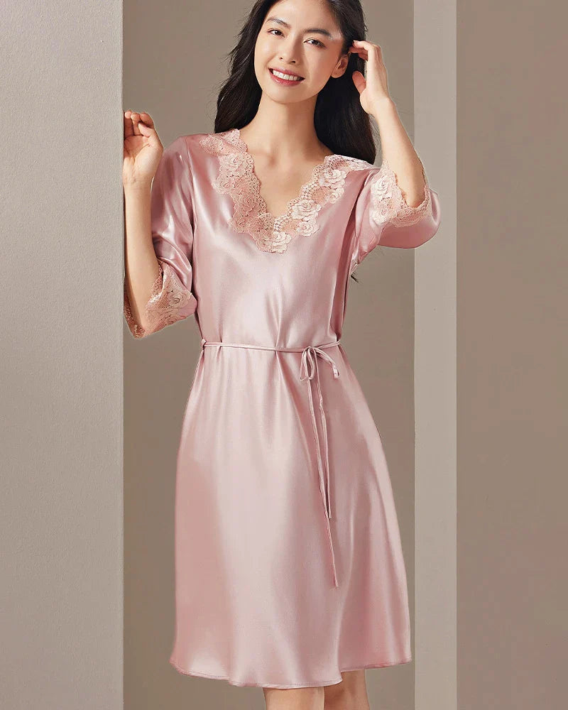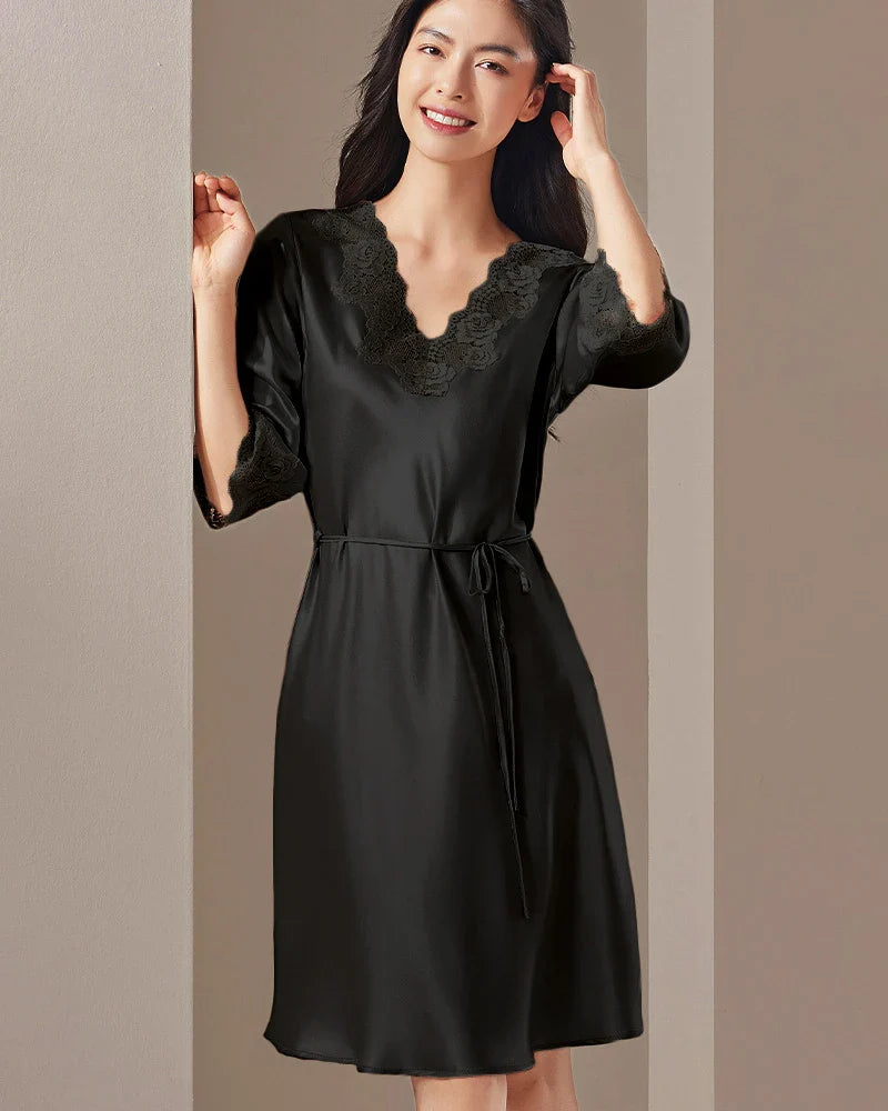 このVネックのシルクナイトガウンは、優雅な3/4袖とウエストラインを引き立てる同素材のシルクベルトが特徴で、洗練されたシルエットを演出します。レーストリムのナイトドレスは女性らしさと上品さを兼ね備えており、クラシックなシルクのナイトシャツにロマンチックな要素を加えたい方に最適です。