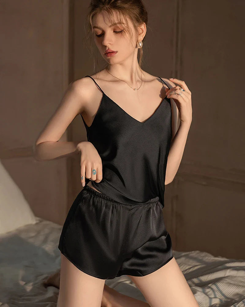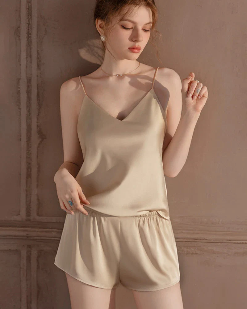 女性らしいVネックのキャミソールとお揃いのシルクパジャマショーツが、リラックスしながらも美しいシルエットを作り出します。くつろぎの時間でも睡眠時でも、このセットがあなたの夜のルーティンを格上げします。シルクのパジャマショートセットやキャミ&ショーツパジャマセットのファンには必須のアイテムで、細部にまで時代を超えたエレガンスが息づいています。