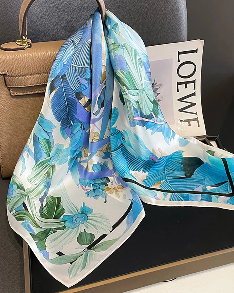 この正方形のシルクスカーフは、水彩画風のリリーフラワーと様々な葉の形を、柔らかいブルーとグリーンのトーンで表現したプリントです。芸術的な花と葉のパターンにより、印象的なプリントシルクスカーフ、フローラルシルクスカーフ、または洗練されたシルクショールとしてお使いいただけます。片面プリントで、上品で軽やかな仕上がりと優雅なドレープを実現しています。