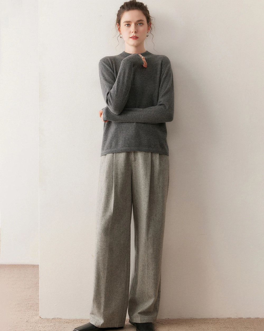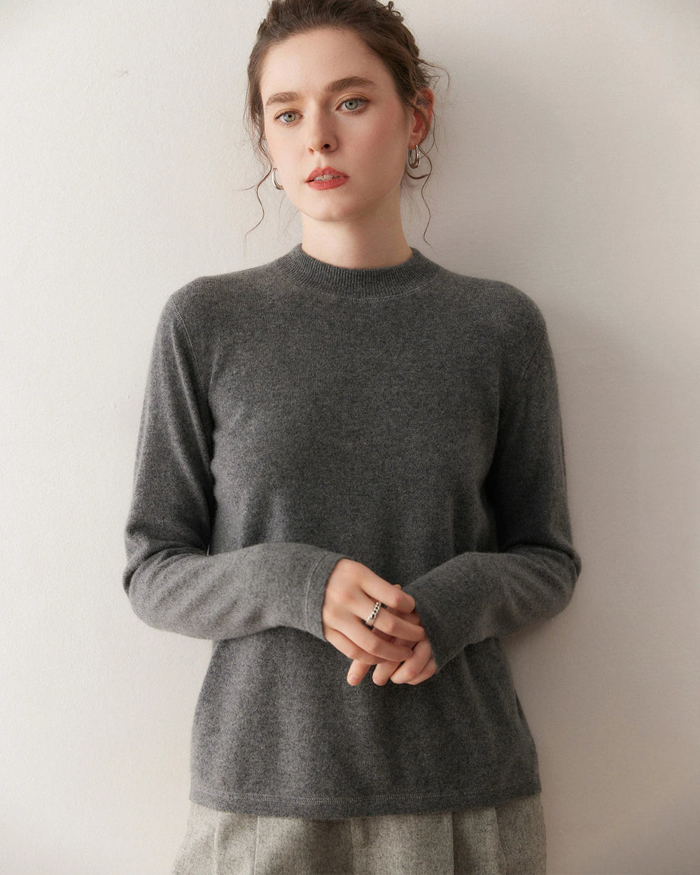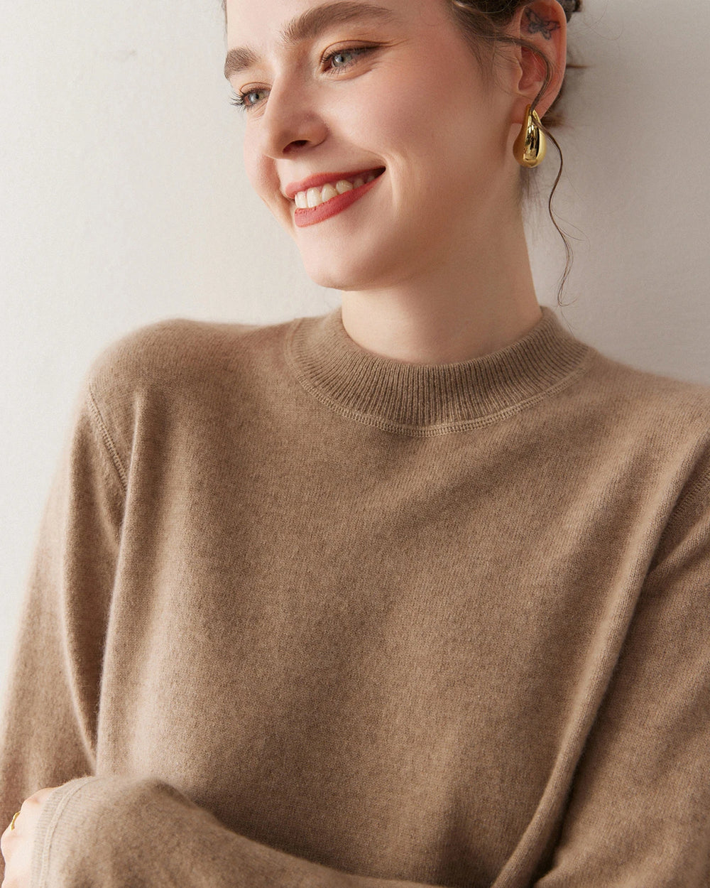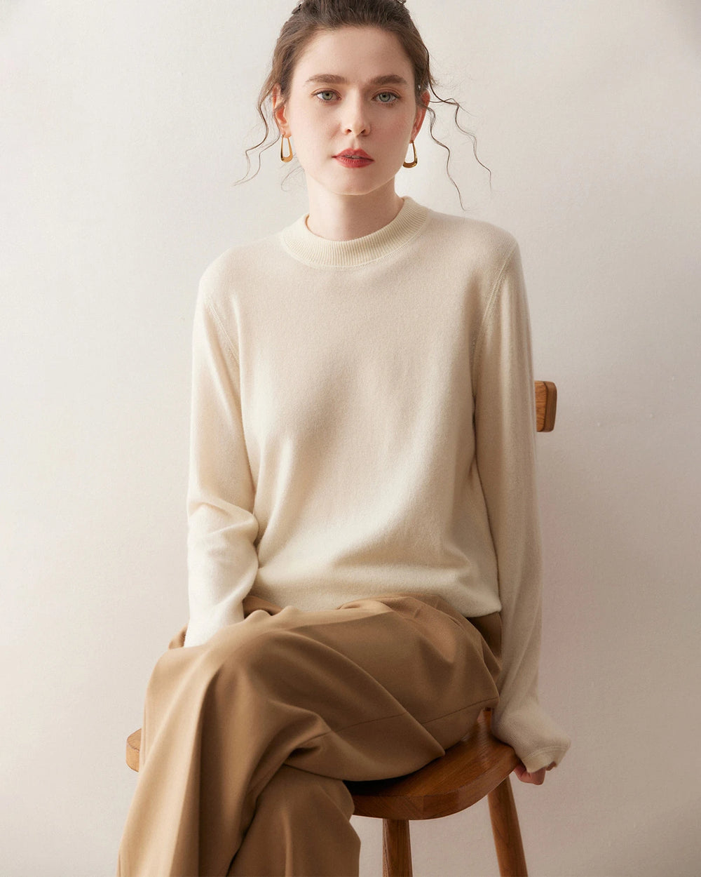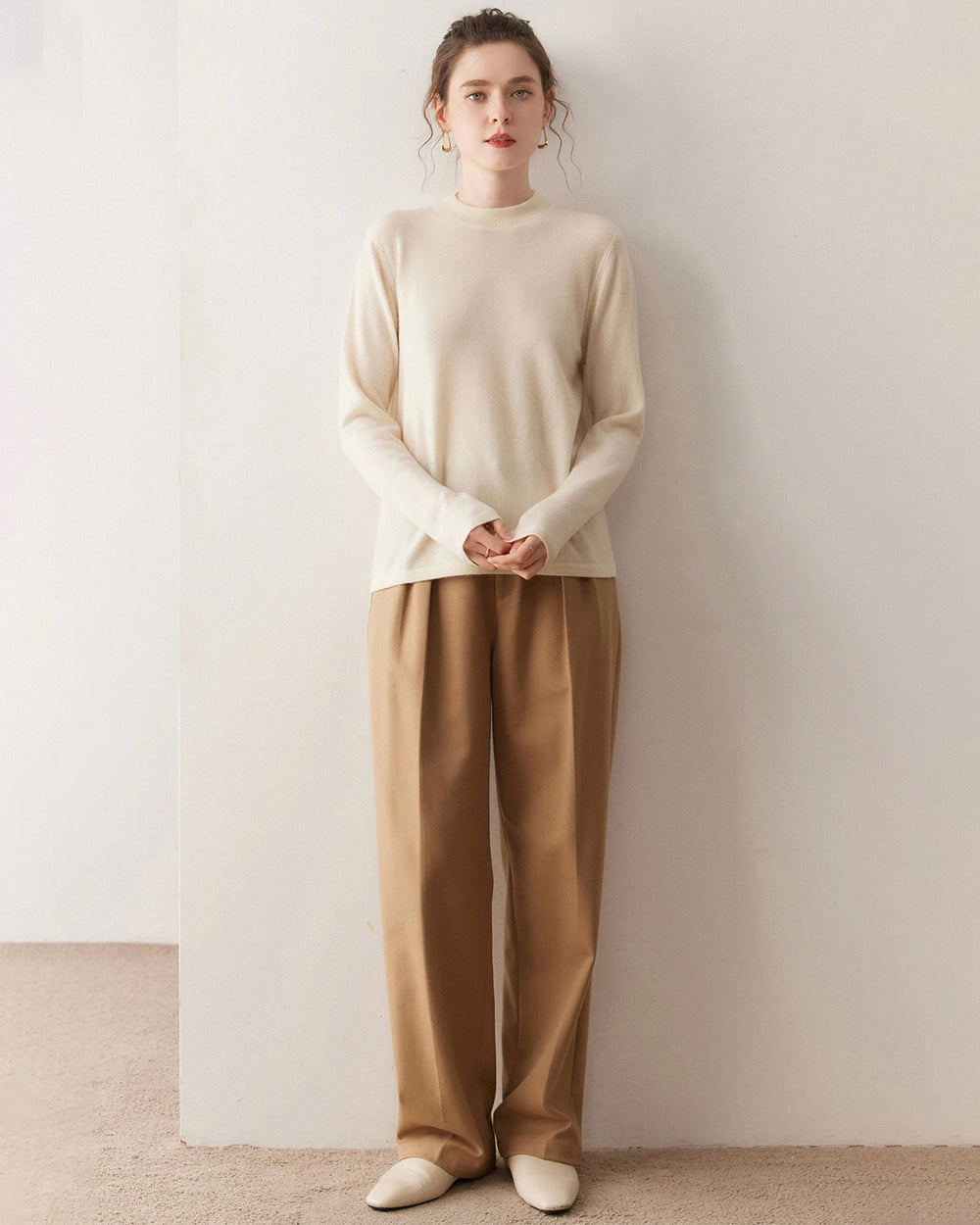 このカシミヤプルオーバーは、上品なモックネックと滑らかなフラットロックステッチ(高級Tシャツにも使われる縫製技術)を採用し、リラックスしながらも洗練された印象を与えます。ミニマルなシルエットが魅力の、ワードローブの中でも最も万能なレディースカシミヤプルオーバーのひとつです。