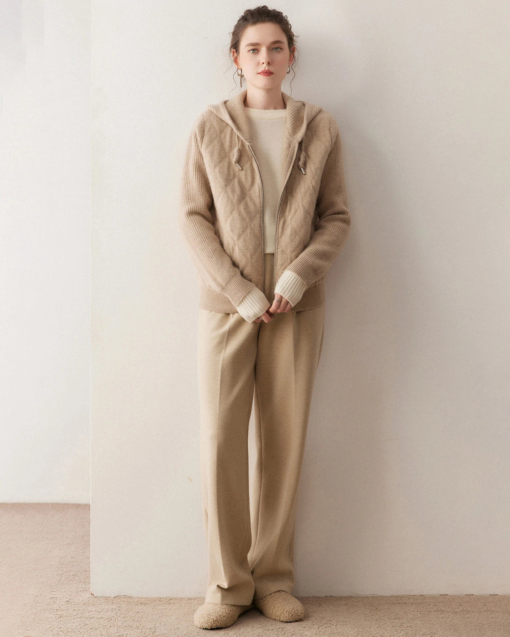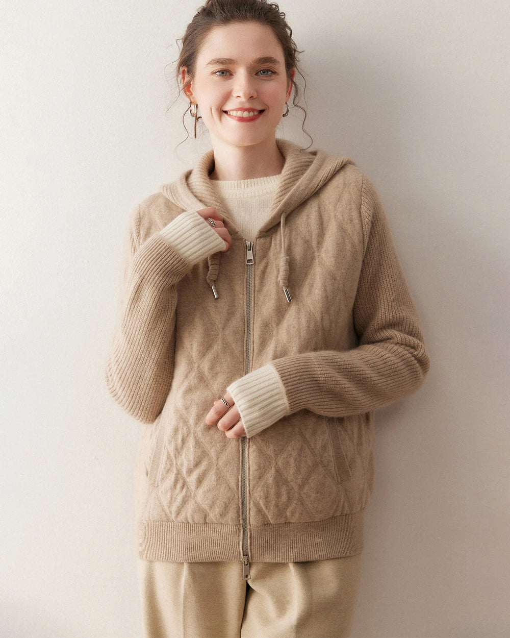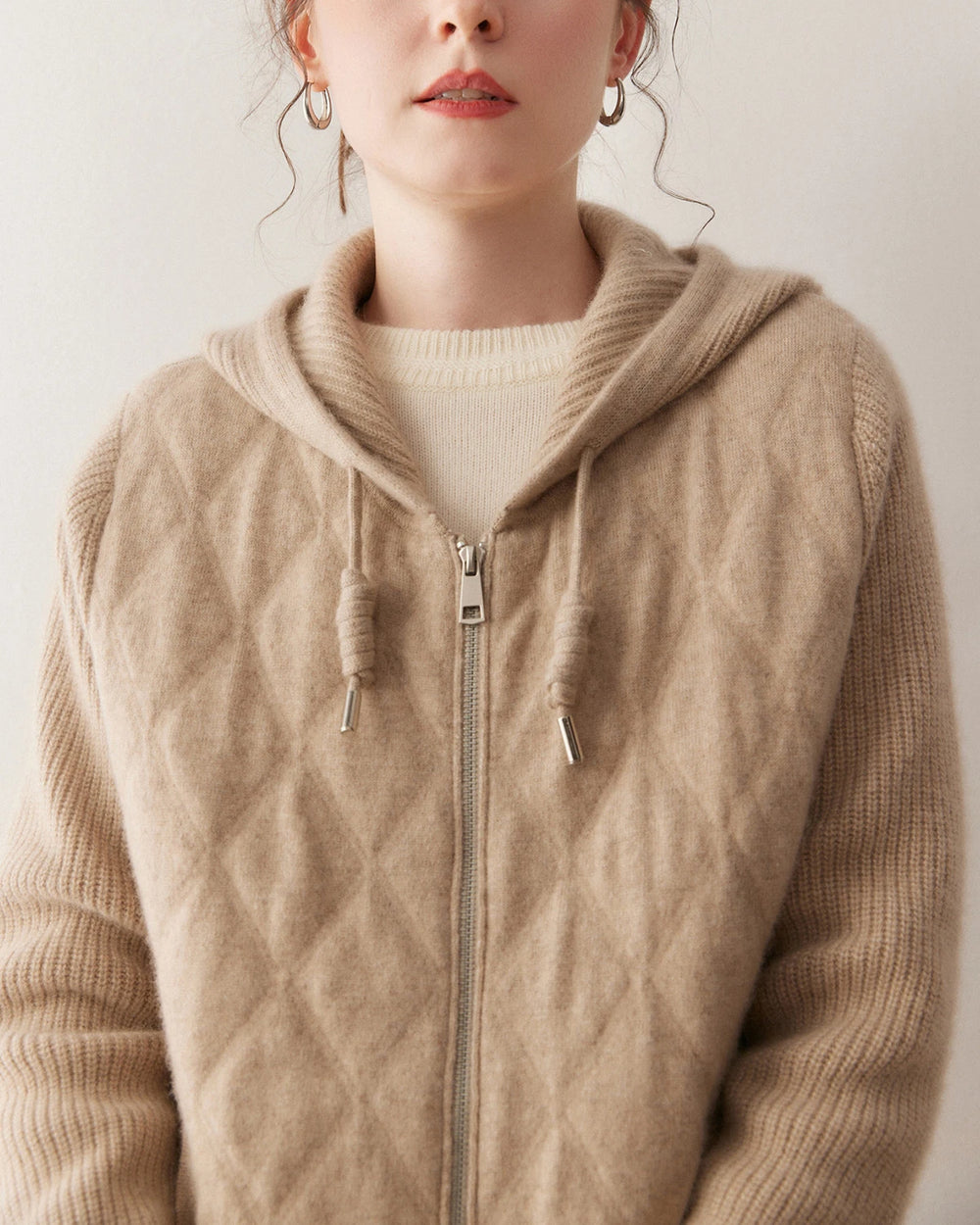 ユニークなダイヤ型ケーブル編みが特徴のこのジップアップカシミヤカーディガンは、カジュアルとラグジュアリーを絶妙に融合させたデザインです。フードとフルジップ仕様がスポーティな印象を加え、上質な編み地が洗練された雰囲気を演出します。機能性とファッション性、職人技が調和した上品な一枚です。