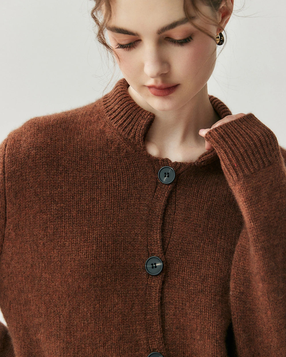 ハーフハイネックのカーディガンはややショート丈でリラックスシルエットのモダンなデザイン。