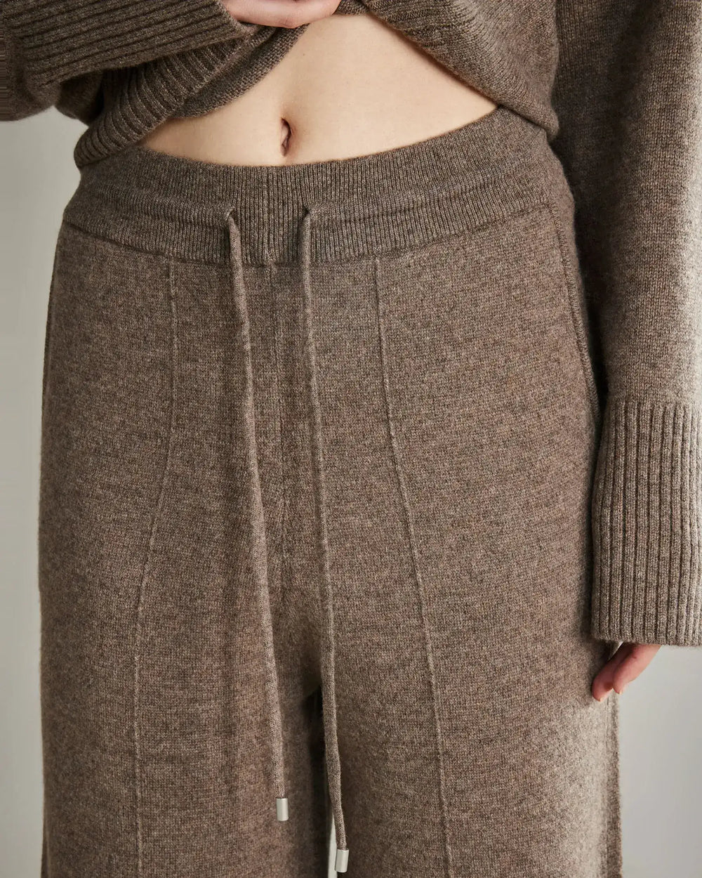 贅沢な柔らかさとリラックス感を兼ね備えたワイドレッグのカシミヤルームパンツ。ドローストリング仕様のウエストでフィット感を調整でき、自宅でのリラックスタイムやカジュアルなお出かけにも最適です。縫い目はすっきりと仕上げられ、高品質なニットが耐久性とモダンなシルエットを実現します。